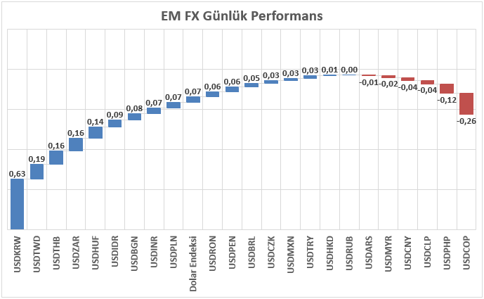 Haftanın dördüncü işlem günündeyiz. Klasik Dolar Endeksi an itibariyle pozitif fiyatlama reaksiyonunu sınırlı bir şekilde sürdürmeye devam etmektedir. Asya, Latin Amerika ve EMEA bölgelerinden 23 gelişmekte olan ülke para birimini kapsayan EM FX sepetinde ise ABD Doları karşısında göreceli performans farklılaşması devam etmektedir. Günlük bazda en zayıf performans Güney Kore Wonu olarak izlenirken, en güçlü para birimi Kolombiya Pesosu olmuştur. Türk Lirası ise sepet içerisinde zayıf tarafta konumlanmaya devam ederken, USDTRY kuru analizin hazırlandığı saatler itibarıyla 43,17 seviyesine yakın işlem görmektedir.