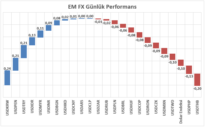 Klasik Dolar Endeksi an itibariyle negatif bir performans sergilese de haftalık bazda iyimser bölgede ve 99 seviyesinin üzerinde kapanış yapmaya çalışmaktadır. Asya, Latin Amerika ve EMEA bölgelerinden 23 gelişmekte olan ülke para birimini kapsayan EM FX sepetinde ise ABD Doları karşısında göreceli performans farklılaşması devam etmektedir. Günlük bazda en zayıf performans Güney Kore Wonu olarak izlenirken, en güçlü para birimi Tayland Bahtı olmuştur. Türk Lirası ise sepet içerisinde zayıf tarafta konumlanmaya devam ederken, USDTRY kuru analizin hazırlandığı saatler itibarıyla 43,25 seviyesine yakın işlem görmektedir.