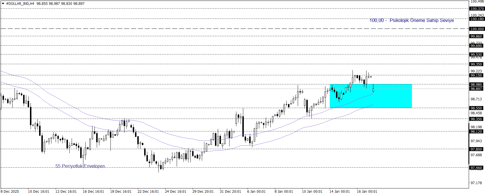 Klasik Dolar Endeksi 98,90 seviyeleri civarında seyrini sürdürürken, teknik olarak yukarı yönlü eğilimini koruyor. Envelopes göstergesinin de işaret ettiği 98,55–98,98 bölgesi ve üzerinde kalındığı sürece, endeksin 100,00 seviyesine doğru yükseliş potansiyelini sürdürmesi beklenebilir. Buna karşın bu bölgenin altındaki kalıcılık, 96,50 seviyesine doğru bir geri çekilme riski öne çıkıyor.