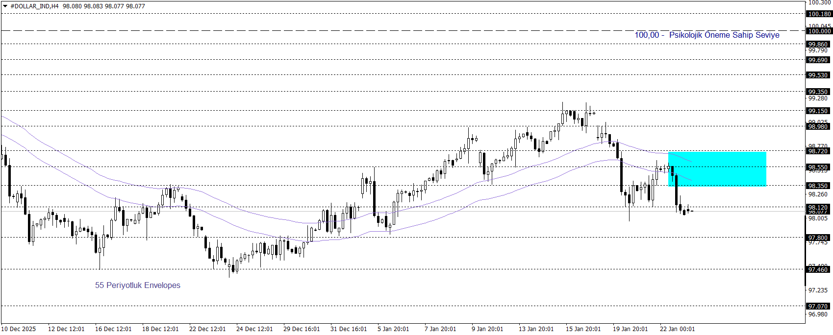 Klasik Dolar Endeksi 98,10 civarında seyrini sürdürürken, teknik olarak aşağı yönlü görünüm yerini koruyor. Envelopes göstergesinin üst bandının da işaret ettiği 98,35–98,72 bölgesi altındaki kalıcılık, endeksin 96,50 seviyesine doğru çekilme potansiyelini sürdürmesi gündemde kalabilir. Buna karşın bu bölgenin üzerindeki kalıcılık, 100,00 seviyesine doğru bir hareket potansiyelini koruyor.