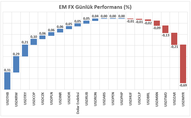 Haftayı tamamlarken dışarıda İmalat ve Hizmet sektörüne yönelik öncü PMI, içeride ise günü tamamladıktan sonra kredi derecelendirme kuruluşlarından Türkiye’nin not ve görünümüne yönelik açıklama yapılması beklenmektedir. Negatif fiyatlamanın haftanın genelinde hakim olduğu Klasik Dolar Endeksi, 98 seviyesine yaklaştığı bir süreçte an itibariyle sınırlı pozitif fiyatlama ile işlem görmektedir. Asya, Latin Amerika ve EMEA bölgelerinden seçili gelişmekte olan ülke para birimlerinin yanı sıra, bölgesel karşılaştırma amacıyla dahil edilen sınırlı sayıda para birimini içeren EM FX sepetinde ise ABD Doları karşısında göreceli performans farklılaşması devam etmektedir. Günlük bazda en zayıf performans Tayland Bahtı olarak izlenirken, en güçlü para birimi Malezya Ringgiti olmuştur. Türk Lirası ise sepet içerisinde zayıf tarafta konumlanmaya devam ederken, USDTRY kuru analizin hazırlandığı saatler itibarıyla 43,31 seviyesine yakın işlem görmektedir.