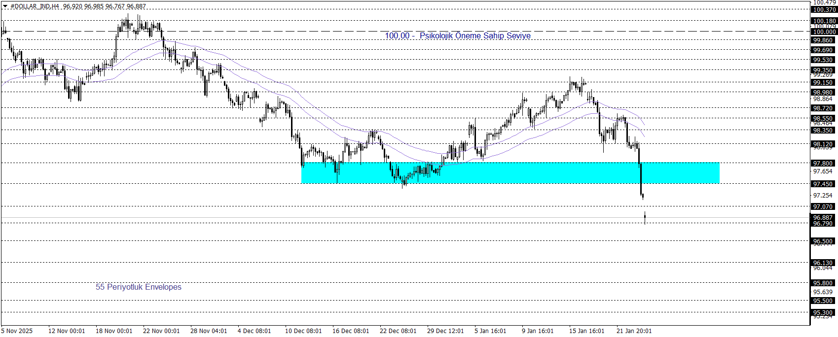 Klasik Dolar Endeksi 96,80 civarında seyrini sürdürürken, teknik göstergeler aşağı yönlü görünümün halen korunduğuna işaret ediyor. Endeks, 97,45–97,80 bölgesi altında seyrini sürdürdükçe 95,80 seviyesine doğru çekilme potansiyelini sürdürmesi gündemde kalabilir. Öte yandan, söz konusu bölgenin aşılması ve üzerinde kalıcı bir seyir oluşması halinde, 100,00 seviyesine doğru güçlü bir toparlanma hareketinin önü açılabilir.