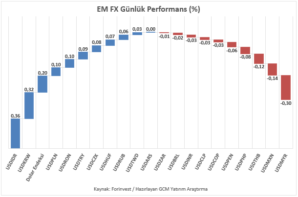 Haftaya negatif bir başlangıç yapan ve haftalardır dip kabul ettiğimiz 97,40 seviyesi altına sarkarak baskısını sürdüren Klasik Dolar Endeksi (DXY), son düşüşü ardından dinlenme aşamasında ve an itibariyle sınırlı bir şekilde pozitif işlem görmektedir. Asya, Latin Amerika ve EMEA bölgelerinden seçilmiş gelişmekte olan ülke para birimlerinin yanı sıra, karşılaştırma amacıyla dahil edilen sınırlı sayıdaki para biriminden oluşan EM FX sepetinde ise ABD Doları karşısında göreceli performans ayrışması sürmektedir. Günlük bazda en güçlü performans Malezya Ringgiti, en zayıf para Endonezya Rupisi olarak kaydedilmiştir. Türk Lirası ise sepet içerisinde zayıf tarafta yer almaya devam etmekte olup, USDTRY kuru raporun hazırlandığı saatler itibarıyla 43,39 seviyesine yakın seyretmektedir.