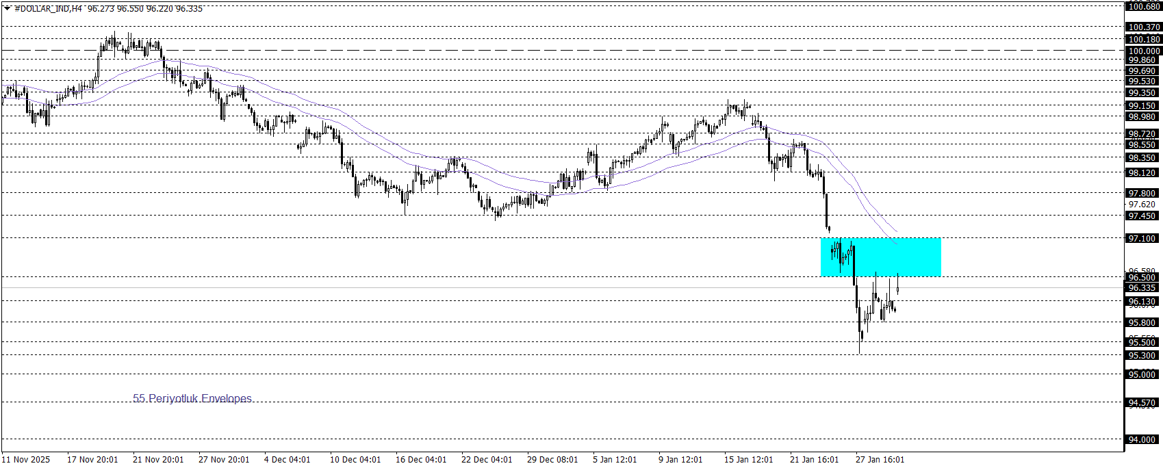 Klasik Dolar Endeksi 95,80 civarında hareket ederken, genel görünüm aşağı yönlü eğilimin korunduğuna işaret ediyor. Envelopes göstergesinin öne çıkardığı 96,50–97,10 bölgesi altında kalındıkça, endeksin 94,00 seviyesine doğru geri çekilme potansiyeli gündemde kalmaya devam edebilir. Buna karşılık, bu bölgenin aşılması ve üzerinde kalıcılık sağlanması durumunda 97,80 seviyesine doğru bir toparlanma alanı oluşabilir.