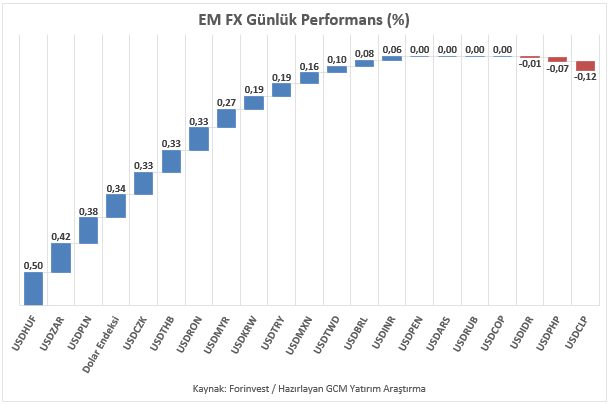 Asya, Latin Amerika ve EMEA bölgelerinden seçilmiş gelişmekte olan ülke para birimlerinin yanı sıra, karşılaştırma amacıyla dahil edilen sınırlı sayıdaki para biriminden oluşan EM FX sepetinde ise ABD Doları karşısında göreceli performans ayrışması sürmektedir. Özellikle de önemli bir çoğunluğun güçlü Dolar karşısında anlık reaksiyonda zayıf kaldığını söyleyebiliriz. Günlük bazda en zayıf performans Macar Forinti, en güçlü performans Şili Pesosu olarak kaydedilmiştir. Türk Lirası ise sepet içerisinde zayıf tarafta yer almaya devam etmekte olup, USDTRY kuru raporun hazırlandığı saatler itibarıyla 43,47 seviyesine yakın seyretmektedir.