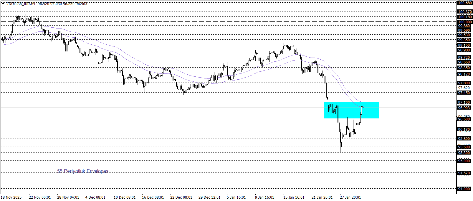 Klasik Dolar Endeksi 96,90 civarında hareket ederken teknik açıdan bir karar aşamasına işaret ediyor. Aşağı yönlü hareketlerde, Envelopes göstergesinin öne çıkardığı 96,50–97,10 bölgesi altında kalındığı sürece endeksin 94,00 seviyesine doğru geri çekilme potansiyeli gündemde kalabilir. Buna karşılık, söz konusu bölgenin aşılması ve üzerinde kalıcılık sağlanması durumunda 97,80 seviyesine doğru bir toparlanma alanı oluşması beklenebilir.