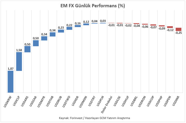Asya, Latin Amerika ve EMEA bölgelerinden seçilmiş gelişmekte olan ülke para birimlerinin yanı sıra, karşılaştırma amacıyla dahil edilen sınırlı sayıdaki para biriminden oluşan EM FX sepetinde ise ABD Doları karşısında göreceli performans ayrışması sürmektedir. Günlük bazda en zayıf performans Güney Kore Wonu, en güçlü performans Hindistan Rupisi olarak kaydedilmiştir. Türk Lirası ise sepet içerisinde zayıf tarafta yer almaya devam etmekte olup, USDTRY kuru raporun hazırlandığı saatler itibarıyla 43,50 seviyesine yakın seyretmektedir.
