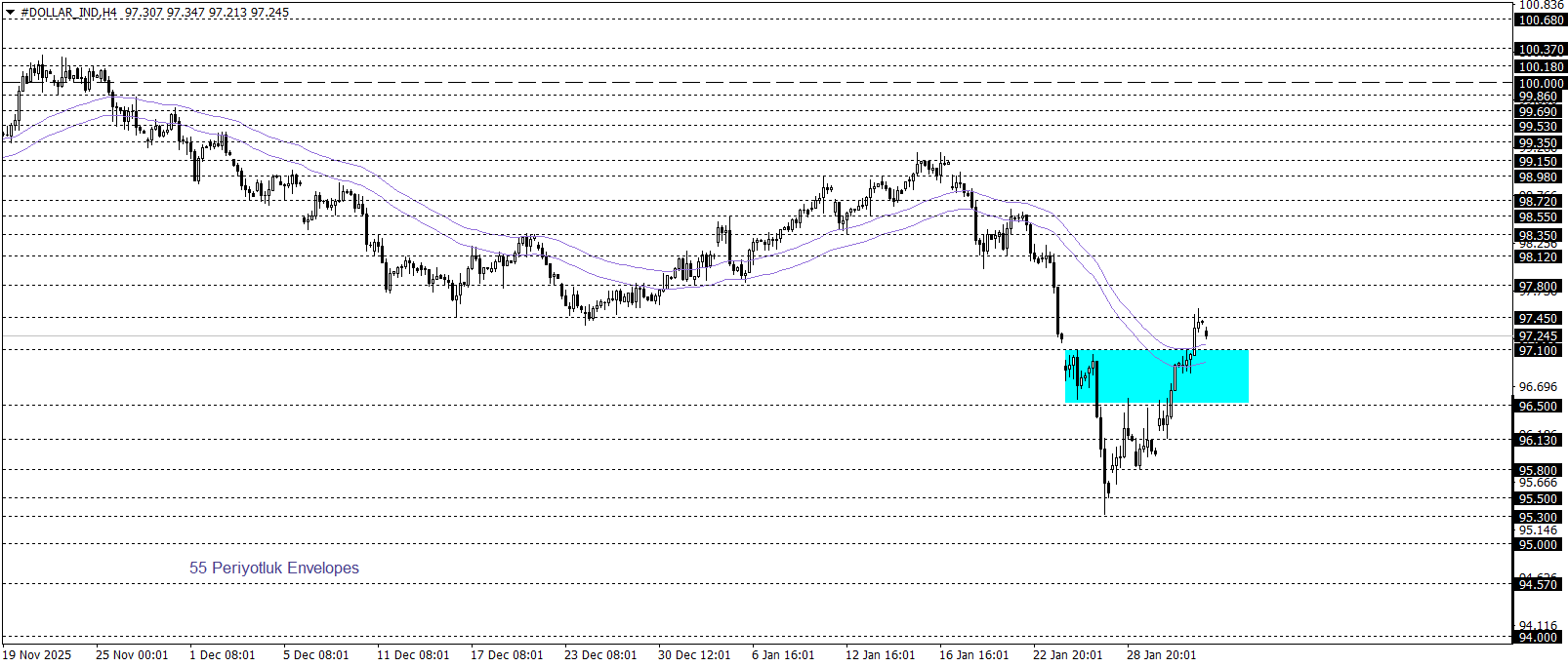 Klasik Dolar Endeksi 96,20 civarında fiyatlanırken, teknik görünüm yukarı yönlü eğilimin öne çıktığına işaret ediyor. Envelopes göstergesinin işaret ettiği 96,50–97,10 bölgesinin üzerinde kalıcılık devam ettiği sürece, endekste 99,15 seviyesine doğru toparlanma potansiyeli gündemde kalabilir. Buna karşın, aşağı yönlü hareketlerde söz konusu bölgenin altında kalındığı sürece 94,00 seviyesine doğru geri çekilme riski korunmaktadır.
