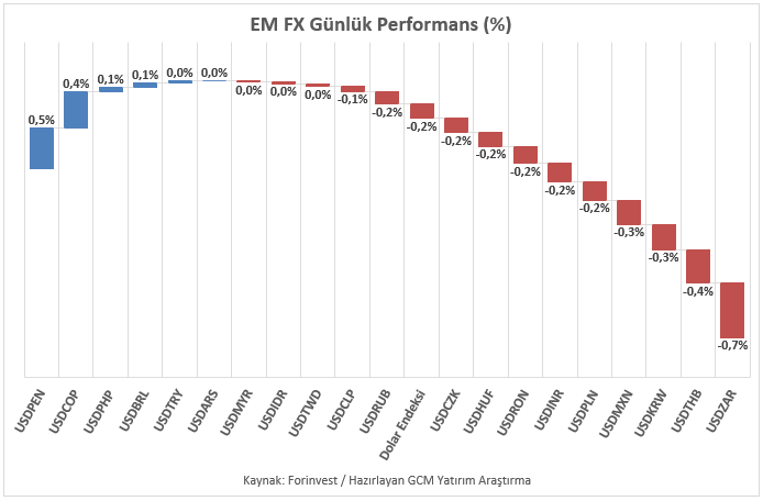 Asya, Latin Amerika ve EMEA bölgelerinden seçilmiş gelişmekte olan ülke para birimlerinin yanı sıra, karşılaştırma amacıyla dahil edilen sınırlı sayıdaki para biriminden oluşan EM FX sepetinde ise ABD Doları karşısında göreceli performans ayrışması sürmektedir. Günlük bazda en zayıf performans Peru Solu, en güçlü performans Güney Afrika Randı olarak kaydedilmiştir. Türk Lirası ise sepet içerisinde nötr tarafta yer almaya devam etmekte olup, USDTRY kuru raporun hazırlandığı saatler itibarıyla 43,44 seviyesine yakın seyretmektedir.