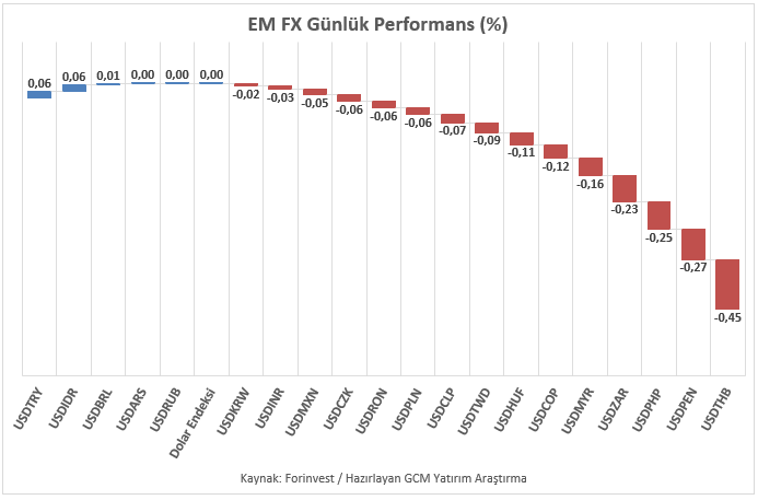 Asya, Latin Amerika ve EMEA bölgelerinden seçilmiş gelişmekte olan ülke para birimlerinin yanı sıra, karşılaştırma amacıyla dahil edilen sınırlı sayıdaki para biriminden oluşan EM FX sepetinde ise ABD Doları karşısında göreceli performans ayrışması sürmektedir. Günlük bazda en zayıf performans Endonezya Rupisi, en güçlü performans Tayland Bahtı olarak kaydedilmiştir. Türk Lirası ise sepet içerisinde negatif tarafta yer almaya devam etmekte olup, USDTRY kuru raporun hazırlandığı saatler itibarıyla 43,50 seviyesine yakın seyretmektedir.