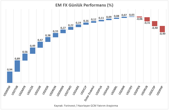 Asya, Latin Amerika ve EMEA bölgelerinden seçilmiş gelişmekte olan ülke para birimlerinin yanı sıra, karşılaştırma amacıyla dahil edilen sınırlı sayıdaki para biriminden oluşan EM FX sepetinde ise ABD Doları karşısında göreceli performans ayrışması sürmektedir. Günlük bazda en zayıf performans Güney Kore Wonu, en güçlü performans Filipin Pesosu olarak kaydedilmiştir. Türk Lirası ise sepet içerisinde negatif tarafta yer almaya devam etmekte olup, USDTRY kuru raporun hazırlandığı saatler itibarıyla 43,53 seviyesine yakın seyretmektedir.