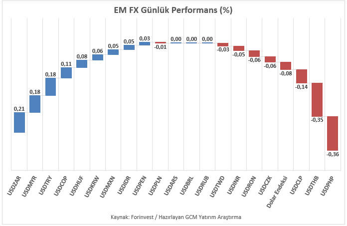 Haftanın geneli itibariyle pozitif reaksiyon izlediğimiz Klasik Dolar Endeksi (DXY), haftanın son işlem gününde an itibariyle sınırlı bir tepki gerçekleştirmektedir. Asya, Latin Amerika ve EMEA bölgelerinden seçilmiş gelişmekte olan ülke para birimlerinin yanı sıra, karşılaştırma amacıyla dahil edilen sınırlı sayıdaki para biriminden oluşan EM FX sepetinde ise ABD Doları karşısında göreceli performans ayrışması sürmektedir. Günlük bazda en zayıf performans Güney Afrika Randı, en güçlü performans Filipin Pesosu olarak kaydedilmiştir. Türk Lirası ise sepet içerisinde negatif tarafta yer almaya devam etmekte olup, USDTRY kuru raporun hazırlandığı saatler itibarıyla 43,61 seviyesine yakın seyretmektedir.