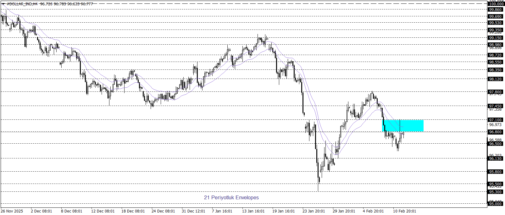Klasik Dolar Endeksi 96,75 seviyeleri etrafında dengelenirken, kısa vadeli teknik görünüm aşağı yönlü eğilimin korunduğuna işaret ediyor. 97,10–96,80 bölgesi altında fiyatlamanın sürmesi halinde, endekste 95,00 seviyesine doğru bir çekilme hareketi sergilenmesi olası görünüyor. Öte yandan, bu kritik bölgenin yukarı yönlü kırılması durumunda, tepkinin artmasıyla birlikte 100,00 seviyesine doğru hareketin gündemde kalacağı değerlendirilmektedir.