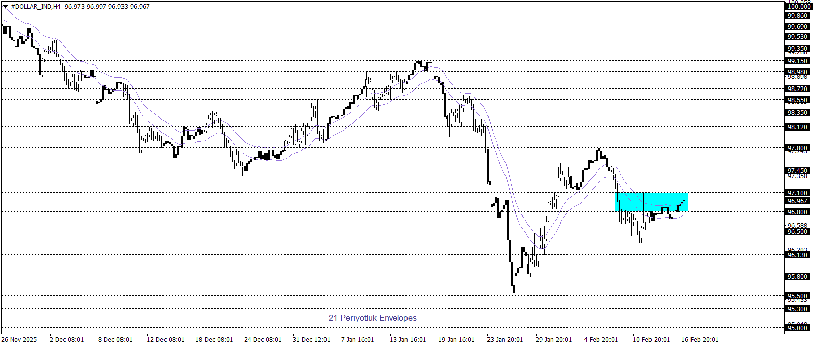 Klasik Dolar Endeksi 96,95 seviyesi çevresinde yatay bir görünüm sergilerken, kısa vadeli teknik göstergeler kararsız yapının sürdüğüne işaret ediyor. 97,10–96,80 bölgesi altında kalıcılık baskının derinleşerek 95,00 seviyesine doğru kademeli bir geri çekilmeye zemin hazırlaması beklenebilir. Buna karşılık, söz konusu bölgenin yukarı yönlü aşılması ve üzerinde kalıcılık sağlanması halinde tepki alımlarının güç kazanarak 100,00 seviyesine doğru daha belirgin bir toparlanma hareketini gündeme taşıyabileceği değerlendirilmektedir.