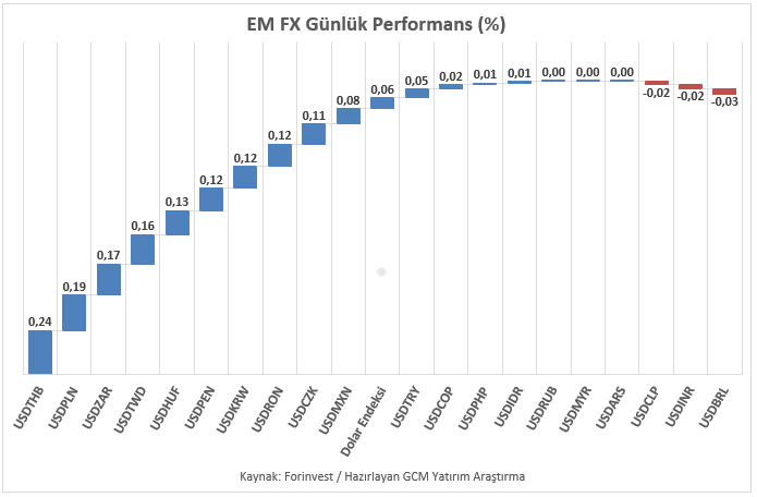 Klasik Dolar Endeksi (DXY), haftaya bir pozitif başlangıç yaparken an itibariyle de pozitif bölgede kalmaya devam etmektedir. Asya, Latin Amerika ve EMEA bölgelerinden seçilmiş gelişmekte olan ülke para birimlerinin yanı sıra, karşılaştırma amacıyla dahil edilen sınırlı sayıdaki para biriminden oluşan EM FX sepetinde ise ABD Doları karşısında göreceli performans ayrışması sürmektedir. Günlük bazda en zayıf performans Tayland Bahtı, en güçlü performans Brezilya Reali olarak kaydedilmiştir. Türk Lirası ise sepet içerisinde zayıf tarafta yer almaya devam etmekte olup, USDTRY kuru raporun hazırlandığı saatler itibarıyla 43,72 seviyesine yakın seyretmektedir.