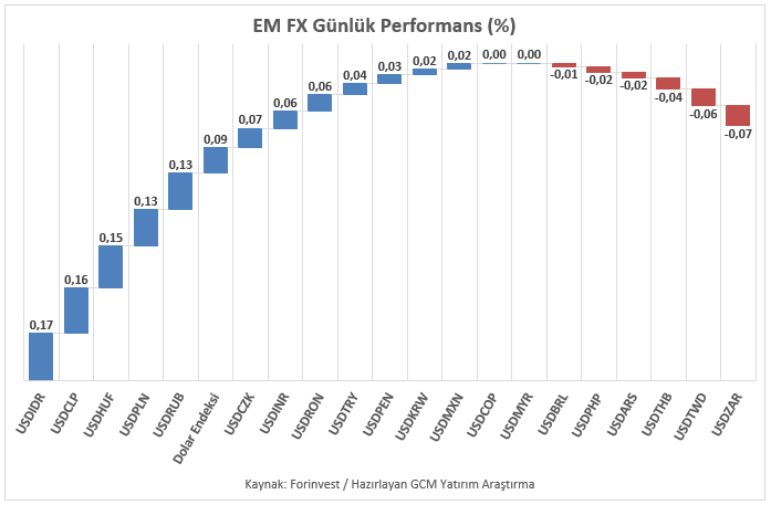 Hafta ortasındayız. Küresel piyasaların ana odak noktası haftayı kapatırken hem büyümenin öncü göstergesi PMI hem de ABD özelinde Fed enflasyon göstergesi PCE ve 4. Çeyrek Büyüme verisi (ilk okuma) sonuçlarında olacaktır. Klasik Dolar Endeksi (DXY), an itibariyle pozitif bölgede kalmaya devam etmektedir. Asya, Latin Amerika ve EMEA bölgelerinden seçilmiş gelişmekte olan ülke para birimlerinin yanı sıra, karşılaştırma amacıyla dahil edilen sınırlı sayıdaki para biriminden oluşan EM FX sepetinde ise ABD Doları karşısında göreceli performans ayrışması sürmektedir. Günlük bazda en zayıf performans Endonezya Rupisi, en güçlü performans Güney Afrika Randı olarak kaydedilmiştir. Türk Lirası ise sepet içerisinde zayıf tarafta yer almaya devam etmekte olup, USDTRY kuru raporun hazırlandığı saatler itibarıyla 43,74 seviyesine yakın seyretmektedir.