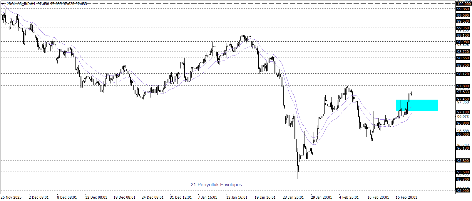 Klasik Dolar Endeksi 97,60 seviyesi çevresinde yukarı yönlü eğilimini korurken, kısa vadeli teknik görünüm toparlanma çabasına işaret etmektedir. 97,10–97,45 bölgesi üzerinde kalıcılığın sürmesi, alım iştahının canlı kalmasını sağlayarak endeksin 100,00 psikolojik direncine doğru kademeli bir tepki hareketi geliştirmesine zemin hazırlayabilir. Buna karşın, söz konusu bölgenin aşağı yönlü ihlal edilmesi ve bu seviye altında fiyatlamaların yerleşik hâle gelmesi durumunda, satış baskısının belirginleşerek 95,00 desteğine doğru daha derin bir düzeltme sürecini gündeme taşıması olası görünmektedir.