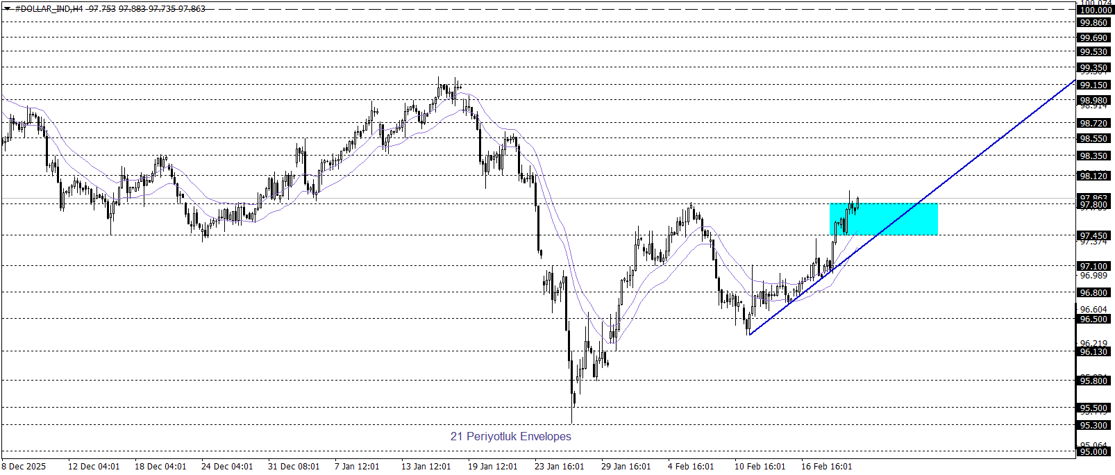 Klasik Dolar Endeksi 97,80 seviyesi çevresinde yukarı yönlü eğilimini korurken, kısa vadeli teknik görünüm toparlanma çabasına işaret etmektedir. 97,80–97,45 bölgesi üzerinde kalıcılığın sürmesi, alım iştahının canlı kalmasını sağlayarak endeksin 100,00 psikolojik direncine doğru kademeli bir tepki hareketi geliştirmesine zemin hazırlayabilir. Buna karşın, söz konusu bölgenin aşağı yönlü ihlal edilmesi ve bu seviye altında fiyatlamaların yerleşik hâle gelmesi durumunda, satış baskısının belirginleşerek 95,00 desteğine doğru daha derin bir düzeltme sürecini gündeme taşıması olası görünmektedir.