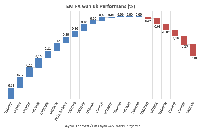 Küresel piyasalar makro ekonomik görünümde bugün büyümenin öncü göstergesi PMI, Fed enflasyon göstergesi PCE ve 4. Çeyrek ABD Büyüme verisi sonuçlarına odaklanacakken jeopolitik risk ana tema olmayı sürdürmektedir. Klasik Dolar Endeksi (DXY), risklere bağlı olacak şekilde haftanın genelinde olduğu gibi an itibariyle pozitif bölgede kalmaya devam etmektedir. Asya, Latin Amerika ve EMEA bölgelerinden seçilmiş gelişmekte olan ülke para birimlerinin yanı sıra, karşılaştırma amacıyla dahil edilen sınırlı sayıdaki para biriminden oluşan EM FX sepetinde ise ABD Doları karşısında göreceli performans ayrışması sürmektedir. Günlük bazda en zayıf performans Filipin Pesosu, en güçlü performans Peru Solu olarak kaydedilmiştir. Türk Lirası ise sepet içerisinde zayıf tarafta yer almaya devam etmekte olup, USDTRY kuru raporun hazırlandığı saatler itibarıyla 43,83 seviyesine yakın seyretmektedir.