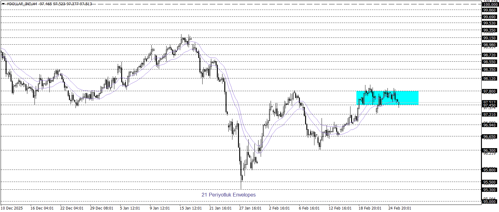 Klasik Dolar Endeksi 97,50 seviyesi çevresinde kısa vadeli teknik göstergeler kararsız yapının sürdüğüne işaret ediyor. 97,45–97,80 bölgesi altında kalıcılık sağlarsa baskının derinleşerek 95,00 seviyesine doğru kademeli bir geri çekilmeye zemin hazırlaması beklenebilir. Buna karşılık, söz konusu bölgenin yukarı yönlü aşılması ve üzerinde kalıcılık sağlanması halinde tepki alımlarının güç kazanarak 100,00 seviyesine doğru daha belirgin bir toparlanma hareketini gündeme taşıyabileceği değerlendirilmektedir.