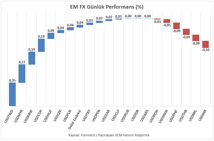 ABD – İran savaşı ile Klasik Dolar Endeksi (DXY) yeni haftaya pozitif bir başlangıç yapmakla birlikte an itibariyle de iyimserliğini sürdürmektedir. 97,80 – 98,00 kontrol bölgesini aşara 95 – 100 orta vadeli bandın üst noktasına yönelik düşünceyi gündemde tutan endeksin haftanın geneli itibariyle performansı yakinen takip edilecektir. Asya, Latin Amerika ve EMEA bölgelerinden seçilmiş gelişmekte olan ülke para birimlerinin yanı sıra, karşılaştırma amacıyla dahil edilen sınırlı sayıdaki para biriminden oluşan EM FX sepetinde ise ABD Doları karşısında göreceli performans ayrışması sürmektedir. Günlük bazda en zayıf performans Tayvan Doları, en güçlü performans Hindistan Rupisi olarak kaydedilmiştir. Türk Lirası ise sepet içerisinde zayıf tarafta yer almaya devam etmekte olup, USDTRY kuru raporun hazırlandığı saatler itibarıyla 43,95 seviyesine yakın seyretmektedir.