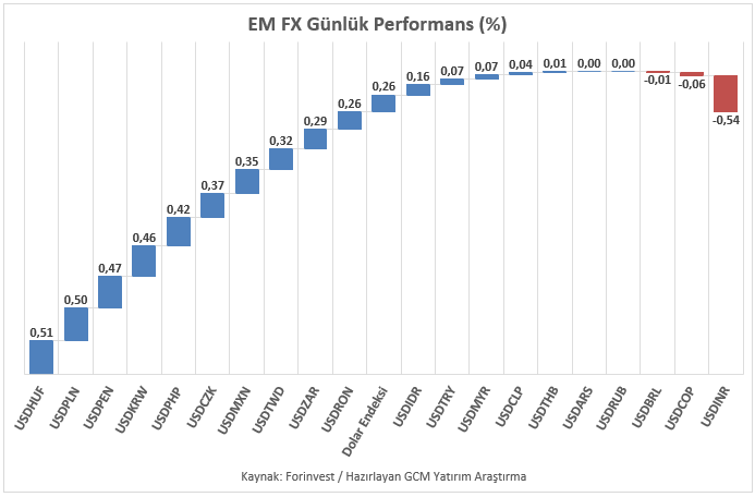 Klasik Dolar Endeksi (DXY), 99 seviyesine yakın, hafta başından bu yana sürdürdüğü iyimserliğini psikolojik 100 seviyesine yaklaştırdıktan sonra yavaşlatan bir performans göstermektedir. An itibariyle de pozitif görünümünü sürdürmektedir. Asya, Latin Amerika ve EMEA bölgelerinden seçilmiş gelişmekte olan ülke para birimlerinin yanı sıra, karşılaştırma amacıyla dahil edilen sınırlı sayıdaki para biriminden oluşan EM FX sepetinde ise ABD Doları karşısında göreceli performans ayrışması sürmektedir. Özellikle güçlü Dolar karşısında para birimlerinin önemli bir kısmının zayıf kaldığını görmekteyiz. Günlük bazda en zayıf performans Macar Forinti, en güçlü performans Hindistan Rupisi olarak kaydedilmiştir. Türk Lirası ise sepet içerisinde zayıf tarafta yer almaya devam etmekte olup, USDTRY kuru raporun hazırlandığı saatler itibarıyla 43,97 seviyesine yakın seyretmektedir.