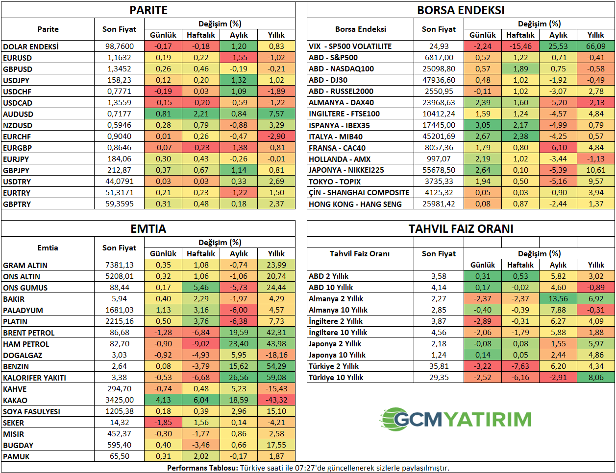 ABD 10 yıllık tahvil faizi 4,14% bölgesinde seyrediyor. Dolar endeksi hafta başındaki düşüş ardından yataya yakın seyrini korudu.
