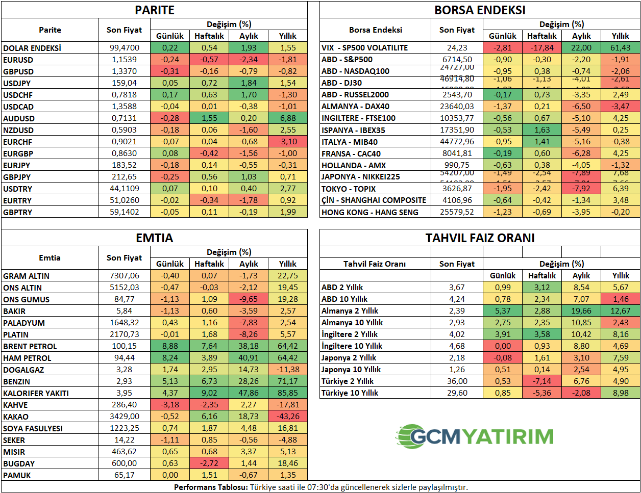 ABD endeksleri dün yataya yakın bir kapanış yaparken, Asya seansında vadeli işlemler 1% civarında gerileme gösterdi. Asya endeksleri de bu durumu takip etti. ABD 10 yıllık tahvil faizi 4,24% bölgesine kadar çıkmış durumda. Dolar endeksi tekrar yükselirken, altın riskten çok dolardaki yükselişten etkilenerek baskılandı.