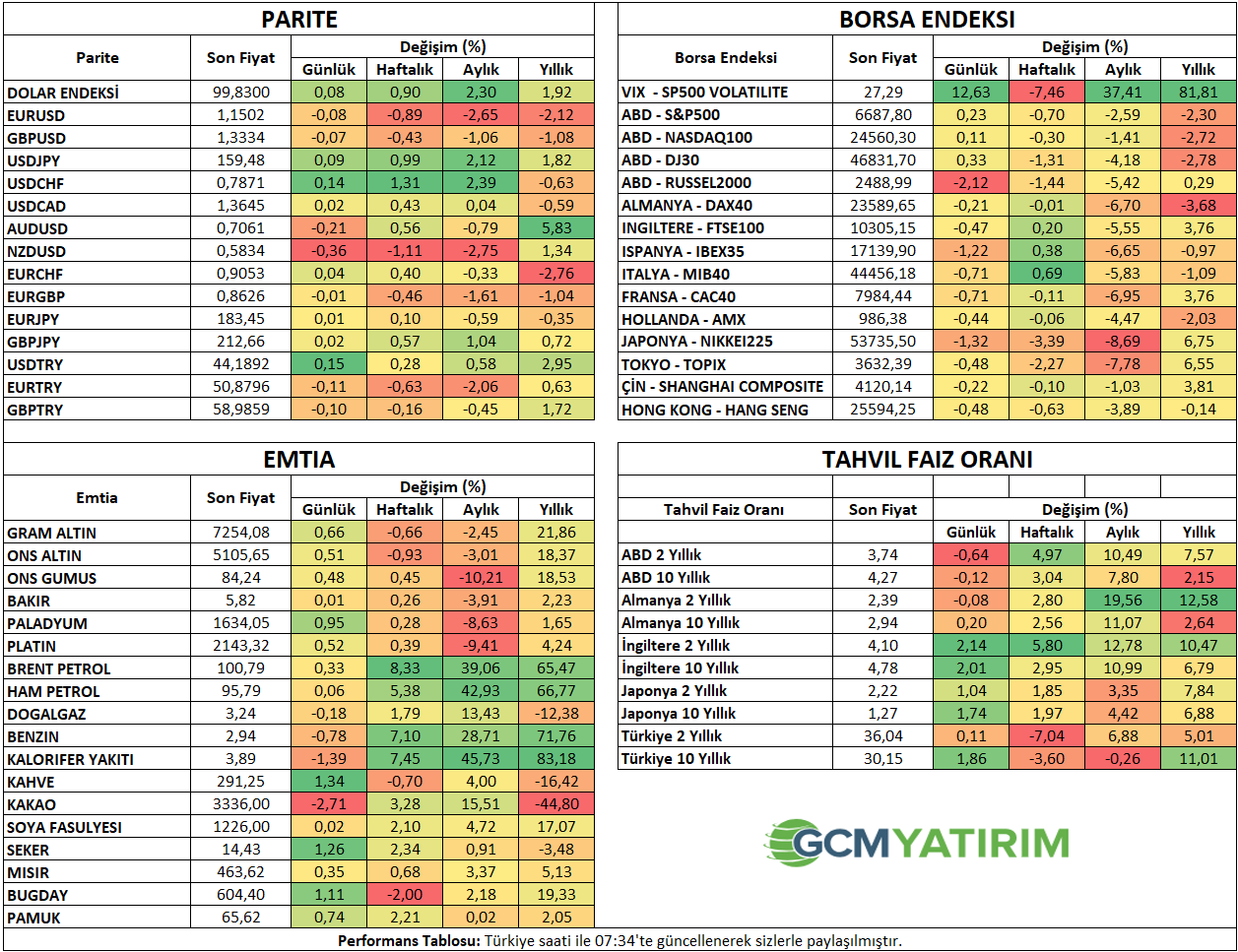 İlgili sayfada yer alan ekonomik takvim içeriği, güvenilir yurt dışı haber ve veri sağlayıcılardan temin edilmektedir. Ekonomik takvim içeriğinde yer alan haberler, haberlerin açıklanma tarihi ve zamanı, önceki, beklenti ve açıklanan rakamlarda gerçekleştirilecek olası değişiklikler, veri sağlayıcı kurumlar tarafından yapılmaktadır. Benzeri durumlardan kaynaklanacak olası değişimlerden GCM Yatırım Menkul Değerler A.Ş. sorumlu tutulamaz.
