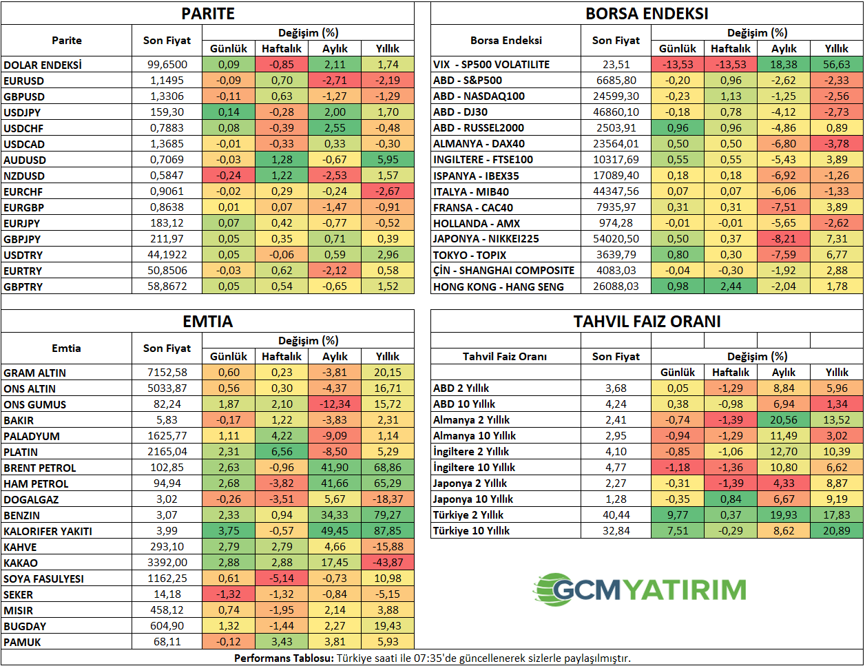 İlgili sayfada yer alan ekonomik takvim içeriği, güvenilir yurt dışı haber ve veri sağlayıcılardan temin edilmektedir. Ekonomik takvim içeriğinde yer alan haberler, haberlerin açıklanma tarihi ve zamanı, önceki, beklenti ve açıklanan rakamlarda gerçekleştirilecek olası değişiklikler, veri sağlayıcı kurumlar tarafından yapılmaktadır. Benzeri durumlardan kaynaklanacak olası değişimlerden GCM Yatırım Menkul Değerler A.Ş. sorumlu tutulamaz.