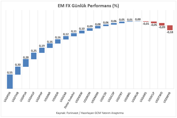 Asya, Latin Amerika ve EMEA bölgelerinden seçilmiş gelişmekte olan ülke para birimlerinin yanı sıra, karşılaştırma amacıyla dahil edilen sınırlı sayıdaki para biriminden oluşan EM FX sepetinde ise ABD Doları karşısında göreceli performans ayrışması sürmektedir. Günlük bazda en zayıf performans Peru Solu, en güçlü performans Malezya Ringgiti olarak kaydedilmiştir. Türk Lirası ise sepet içerisinde zayıf tarafta yer almaya devam etmekte olup, USDTRY kuru raporun hazırlandığı saatler itibarıyla 44,18 seviyesine yakın seyretmektedir.
