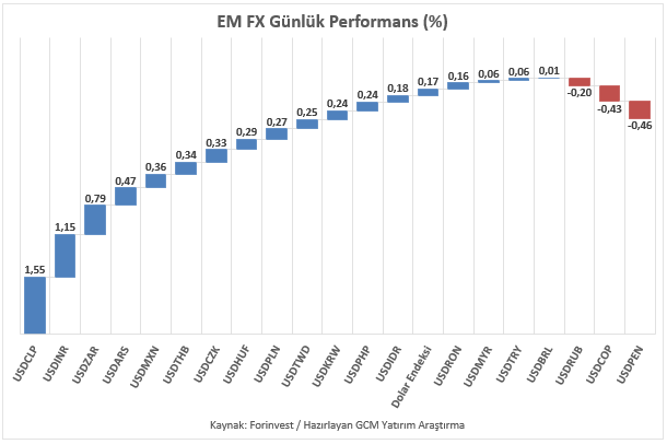 Klasik Dolar Endeksi (DXY), psikolojik 100 / teorik 100,35 bölgesi üzerinde kalıcı bir reaksiyon izleyemediği için sergilediği baskı ile yeni bir haftaya başlarken an itibariyle sınırlı bir pozitif fiyatlama ile 99,50 seviyesine yakın işlem görmektedir. Asya, Latin Amerika ve EMEA bölgelerinden seçilmiş gelişmekte olan ülke para birimlerinin yanı sıra, karşılaştırma amacıyla dahil edilen sınırlı sayıdaki para biriminden oluşan EM FX sepetinde ise ABD Doları karşısında göreceli performans ayrışması sürmektedir. Günlük bazda en zayıf performans Şili Pesosu, en güçlü performans Peru Solu olarak kaydedilmiştir. Türk Lirası ise sepet içerisinde zayıf tarafta yer almaya devam etmekte olup, USDTRY kuru raporun hazırlandığı saatler itibarıyla 44,30 seviyesine yakın seyretmektedir.