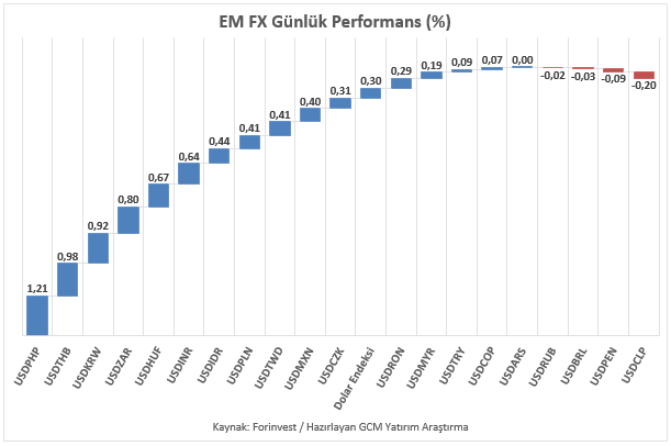 Asya, Latin Amerika ve EMEA bölgelerinden seçilmiş gelişmekte olan ülke para birimlerinin yanı sıra, karşılaştırma amacıyla dahil edilen sınırlı sayıdaki para biriminden oluşan EM FX sepetinde ise ABD Doları karşısında göreceli performans ayrışması sürmektedir. Günlük bazda en zayıf performans Filipin Pesosu, en güçlü performans Şili Pesosu olarak kaydedilmiştir. Türk Lirası ise sepet içerisinde zayıf tarafta yer almaya devam etmekte olup, USDTRY kuru raporun hazırlandığı saatler itibarıyla 44,34 seviyesine yakın seyretmektedir.