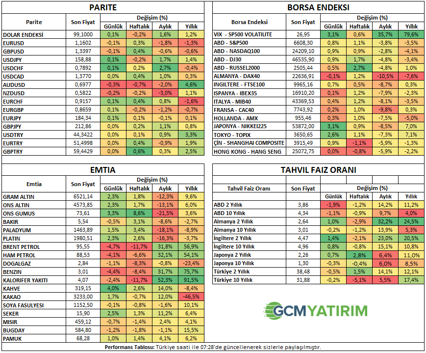 Emtia tarafında hareket daha net. Petrol fiyatları arz endişelerinin zayıflamasıyla birlikte %5’i aşan gerileme görülürken, önceki günlerde baskı altında kalan değerli metallerde toparlanma görülüyor. Altın ve gümüşteki yükseliş, risk algısındaki yumuşamanın yanı sıra dolar tarafındaki geri çekilmeden de destek buluyor. Burada dikkat çeken ayrışma ise, son dönemde bozulan korelasyonların yeniden çalışmaya başlaması. Hafta başından bu yana üzerinde durduğumuz ana göstergelerin (233 günlük ortalama, 4100 ve 60 dolar) destek verdiği bu süreç, dolardaki geri çekilme ile değerli metallerin iyimserliğini cesaretlendirmektedir.
