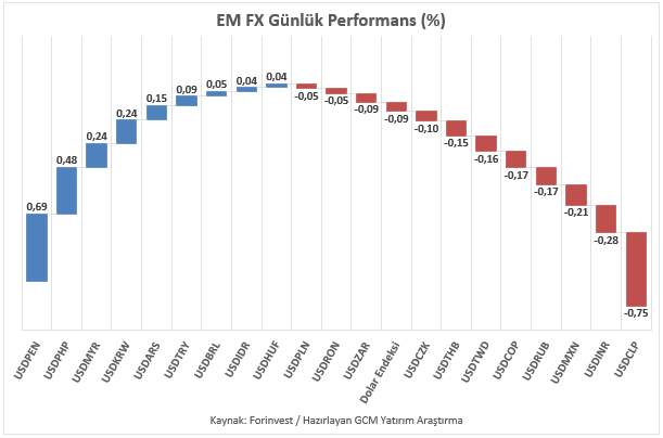 Asya, Latin Amerika ve EMEA bölgelerinden seçilmiş gelişmekte olan ülke para birimlerinin yanı sıra, karşılaştırma amacıyla dahil edilen sınırlı sayıdaki para biriminden oluşan EM FX sepetinde ise ABD Doları karşısında göreceli performans ayrışması sürmektedir. Günlük bazda en zayıf performans Peru Solu, en güçlü performans Şili Pesosu olarak kaydedilmiştir. Türk Lirası ise sepet içerisinde zayıf tarafta yer almaya devam etmekte olup, USDTRY kuru raporun hazırlandığı saatler itibarıyla 44,45 seviyesine yakın seyretmektedir.