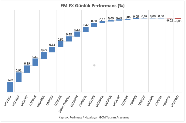 Asya, Latin Amerika ve EMEA bölgelerinden seçilmiş gelişmekte olan ülke para birimlerinin yanı sıra, karşılaştırma amacıyla dahil edilen sınırlı sayıdaki para biriminden oluşan EM FX sepetinde ise ABD Doları karşısında göreceli performans ayrışması sürmektedir. Özellikle listenin önemli bir çoğunluğunu güçlü Dolar karşısında zayıf kaldığını görmekteyiz. Günlük bazda en zayıf performans Güney Afrika Randı, en güçlü performans ise Tayvan Doları olarak kaydedilmiştir. Türk Lirası ise sepet içerisinde zayıf tarafta yer almaya devam etmekte olup, USDTRY kuru raporun hazırlandığı saatler itibarıyla 44,49 seviyesine yakın seyretmektedir.
