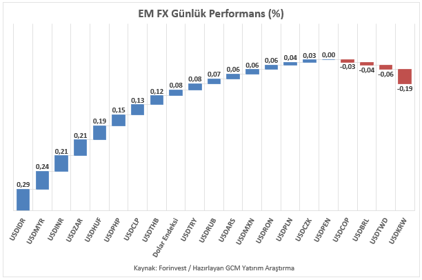 Asya, Latin Amerika ve EMEA bölgelerinden seçilmiş gelişmekte olan ülke para birimlerinin yanı sıra, karşılaştırma amacıyla dahil edilen sınırlı sayıdaki para biriminden oluşan EM FX sepetinde ise ABD Doları karşısında göreceli performans ayrışması sürmektedir. Özellikle çoğu para birimimin güçlü Dolar karşısında baskı gördüğünü söyleyebiliriz. Günlük bazda en zayıf performans Endonezya Rupisi, en güçlü performans ise Güney Kore Wonu olarak kaydedilmiştir. Türk Lirası ise sepet içerisinde zayıf tarafta yer almaya devam etmekte olup, USDTRY kuru raporun hazırlandığı saatler itibarıyla 44,59 seviyesine yakın seyretmektedir.