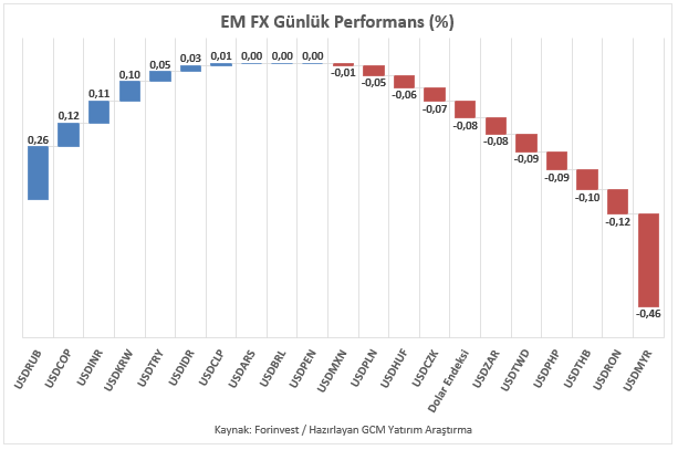 Asya, Latin Amerika ve EMEA bölgelerinden seçilmiş gelişmekte olan ülke para birimlerinin yanı sıra, karşılaştırma amacıyla dahil edilen sınırlı sayıdaki para biriminden oluşan EM FX sepetinde ise ABD Doları karşısında göreceli performans ayrışması sürmektedir. Günlük bazda en zayıf performans Rus Rublesi, en güçlü performans ise Malezya Ringgiti olarak kaydedilmiştir. Türk Lirası ise sepet içerisinde zayıf tarafta yer almaya devam etmekte olup, USDTRY kuru raporun hazırlandığı saatler itibarıyla 44,71 seviyesine yakın seyretmektedir.