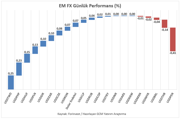 Asya, Latin Amerika ve EMEA bölgelerinden seçilmiş gelişmekte olan ülke para birimlerinin yanı sıra, karşılaştırma amacıyla dahil edilen sınırlı sayıdaki para biriminden oluşan EM FX sepetinde ise ABD Doları karşısında göreceli performans ayrışması sürmektedir. Günlük bazda en zayıf performans Tayvan Doları, en güçlü performans ise Peru Solu olarak kaydedilmiştir. Türk Lirası ise sepet içerisinde zayıf tarafta yer almaya devam etmekte olup, USDTRY kuru raporun hazırlandığı saatler itibarıyla 44,72 seviyesine yakın seyretmektedir.