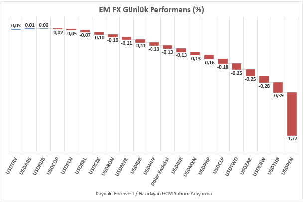 Asya, Latin Amerika ve EMEA bölgelerinden seçilmiş gelişmekte olan ülke para birimlerinin yanı sıra, karşılaştırma amacıyla dahil edilen sınırlı sayıdaki para biriminden oluşan EM FX sepetinde ise ABD Doları karşısında göreceli performans ayrışması sürmektedir. Özellikle Dolar’daki değer kaybı, sepetin çoğunun güçlü kalmasını sağlamıştır. Günlük bazda en zayıf performans Arjantin Pesosu, en güçlü performans ise Peru Solu olarak kaydedilmiştir. Türk Lirası ise sepet içerisinde zayıf tarafta yer almaya devam etmekte olup, USDTRY kuru raporun hazırlandığı saatler itibarıyla 44,73 seviyesine yakın seyretmektedir.