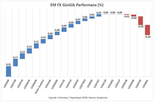 Asya, Latin Amerika ve EMEA bölgelerinden seçilmiş gelişmekte olan ülke para birimlerinin yanı sıra, karşılaştırma amacıyla dahil edilen sınırlı sayıdaki para biriminden oluşan EM FX sepetinde ise ABD Doları karşısında göreceli performans ayrışması sürmektedir. Günlük bazda en zayıf performans Hindistan Rupisi, en güçlü performans ise Brezilya Reali olarak kaydedilmiştir. Türk Lirası ise sepet içerisinde zayıf tarafta yer almaya devam etmekte olup, USDTRY kuru raporun hazırlandığı saatler itibarıyla 44,88 seviyesine yakın seyretmektedir.