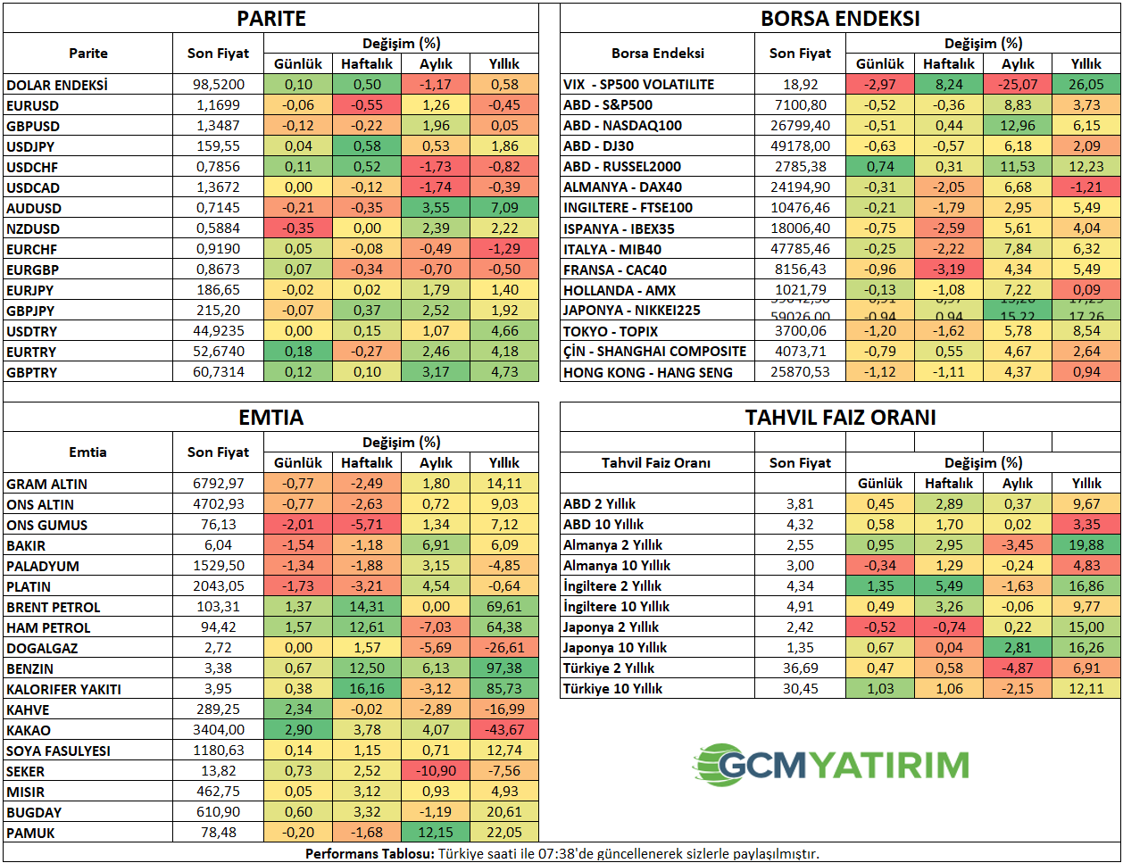 ABD ile İran arasındaki diplomatik sürecin ve Hürmüz Boğazı’nın tıkalı kalmaya devam etmesi petrol fiyatlarını yükseltti. Bu durum hisse piyasaların üzerinde tekrar baskı oluşturdu. Tahvil getirileri yükseliş yaşadı. Daha önce ABD ile İran arasındaki ateşkesin uzatılması haberi ılımlı etki oluşturmuş, fakat Hürmüz Boğazı’nın kapalı kalmaya devam etmesi temkinli yaklaşıma neden olmuştu.