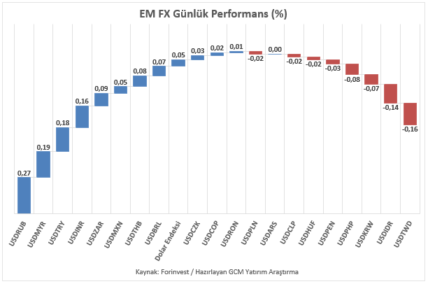 Asya, Latin Amerika ve EMEA bölgelerinden seçilmiş gelişmekte olan ülke para birimlerinin yanı sıra, karşılaştırma amacıyla dahil edilen sınırlı sayıdaki para biriminden oluşan EM FX sepetinde ise ABD Doları karşısında göreceli performans ayrışması sürmektedir. Günlük bazda en zayıf performans Rus Rublesi, en güçlü performans ise Tayvan Doları olarak kaydedilmiştir. Türk Lirası ise sepet içerisinde zayıf tarafta yer almaya devam etmekte olup, USDTRY kuru raporun hazırlandığı saatler itibarıyla 45 seviyesine yakın seyretmektedir.