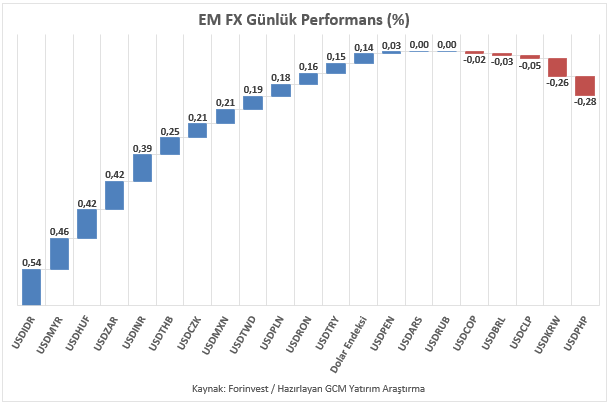 Asya, Latin Amerika ve EMEA bölgelerinden seçilmiş gelişmekte olan ülke para birimlerinin yanı sıra, karşılaştırma amacıyla dahil edilen sınırlı sayıdaki para biriminden oluşan EM FX sepetinde ise ABD Doları karşısında göreceli performans ayrışması sürmektedir. Özellikle güçlü dolar teması, gelişmekte olan çoğu para birimi üzerinde baskı oluşturmuştur. Günlük bazda en zayıf performans Endonezya Rupisi, en güçlü performans ise Filipin Pesosu olarak kaydedilmiştir. Türk Lirası ise sepet içerisinde zayıf tarafta yer almaya devam etmekte olup, USDTRY kuru raporun hazırlandığı saatler itibarıyla 45,18 seviyesine yakın seyretmektedir.