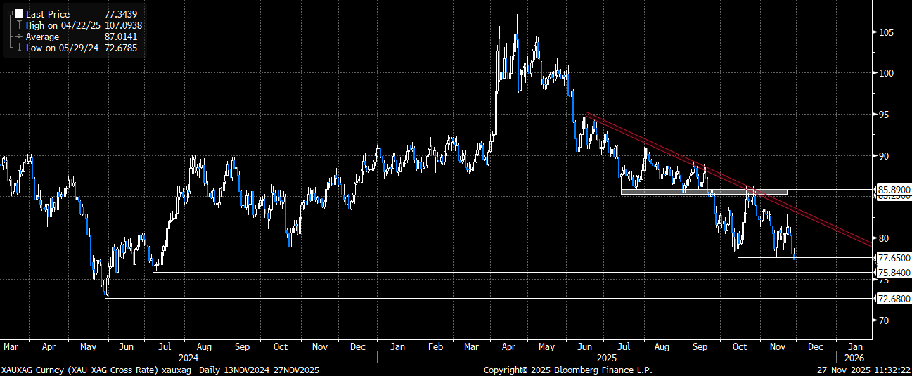 Rasyo gümüşün rekor seviyelere yaklaşmasıyla düşmeye devam ediyor. Gümüşün altına görece daha çok değerlendiği bu dönemde 77,65 seviyesi sürecin devamı için kritik bir eşik. Bu seviyenin kırılması ile 75,84 seviyeleri gündemde olacak. Alternatif durumda altının gümüşe görece değerli kaldığı durumda ise alçalan trend kanalını takip ediyoruz. Bu bölge geçilmediği sürece gümüşün baskısının devam edeceği ni düşünüyoruz.