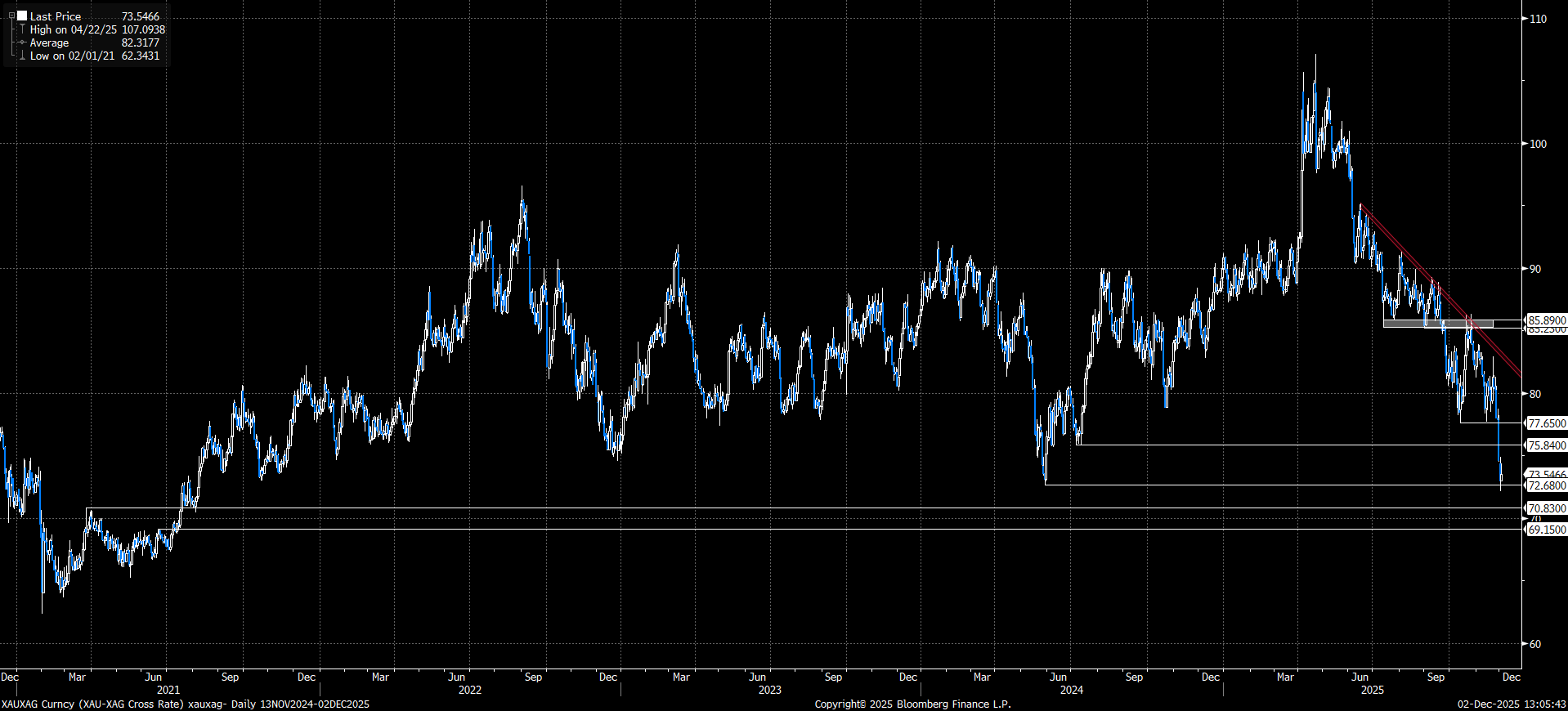 Geçen hafta sergilediği güçlü yükseliş ivmesini koruyan ve yeni zirveler oluşturan gümüş, altın/gümüş rasyosundaki düşüşün sürmesine yol açıyor. Uzun süredir altına göre daha iyi bir performans gösteren gümüş sayesinde rasyo 72,68 seviyesinin de altına inerek (Mayıs 2024) 2021 yazındaki seviyelere kadar geriledi. Genel görünüm aşağı yönü işaret etmeye devam etse de, rasyoda kısa vadede bir düzeltme hareketi görülmesi mümkün. Böyle bir durumda 77,65 seviyesi direnç konumunu koruyor.