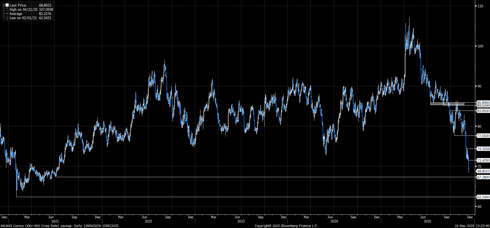 Gümüşün yeni rekor seviyelere yükselmesiyle birlikte rasyodaki sert düşüş eğilimi devam ediyor. 2021 yılı yaz aylarında görülen seviyelere kadar gerileyen rasyoda ilk aşamada 67,19, sonrasında ise 62,51 seviyelerini takip edeceğiz. 62,51 seviyesinin 2014’ten bu yana aşağı yönlü kırılamamış olması, bu bölgenin teknik açıdan önemini artırıyor. Olası toparlanma hareketlerinde ise rasyoda 71,83 seviyesi izleniyor olacak.
