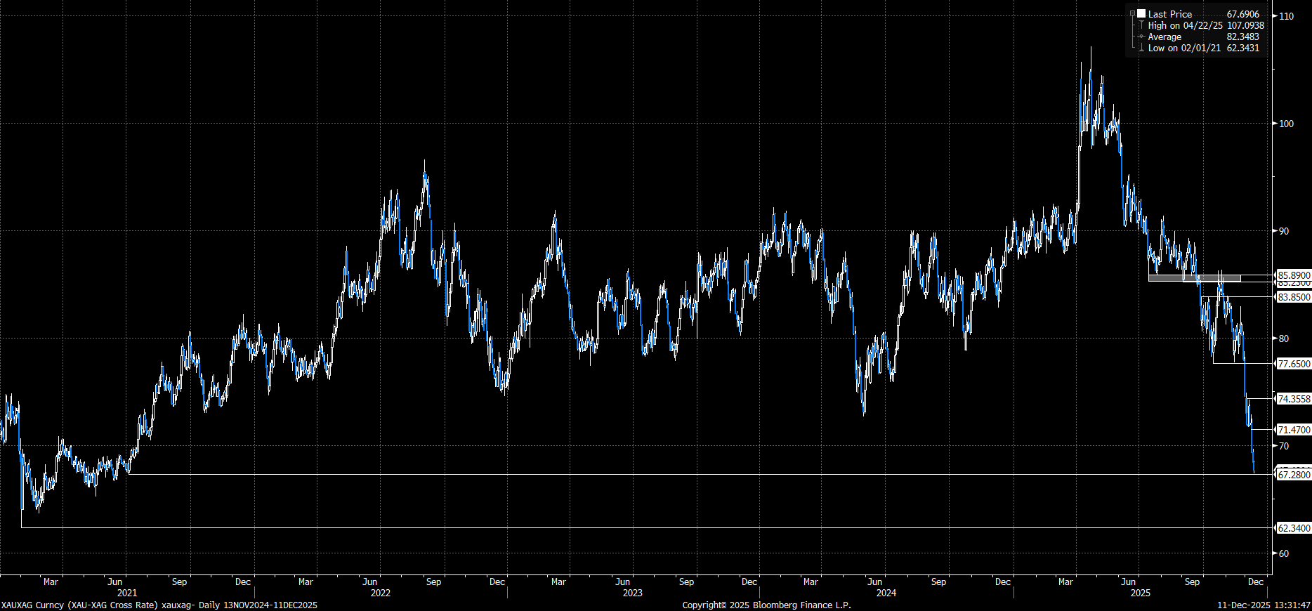 Gümüşün yeni rekor seviyelere yükselmesiyle birlikte rasyodaki sert düşüş eğilimi devam ediyor. 2021 yılı yaz aylarında görülen seviyelere kadar gerileyen rasyoda ilk aşamada 67,19, sonrasında ise 62,51 seviyelerini takip edeceğiz. 62,51 seviyesinin 2014’ten bu yana aşağı yönlü kırılamamış olması, bu bölgenin teknik açıdan önemini artırıyor. Olası toparlanma hareketlerinde ise rasyoda 71,83 seviyesi izleniyor olacak.