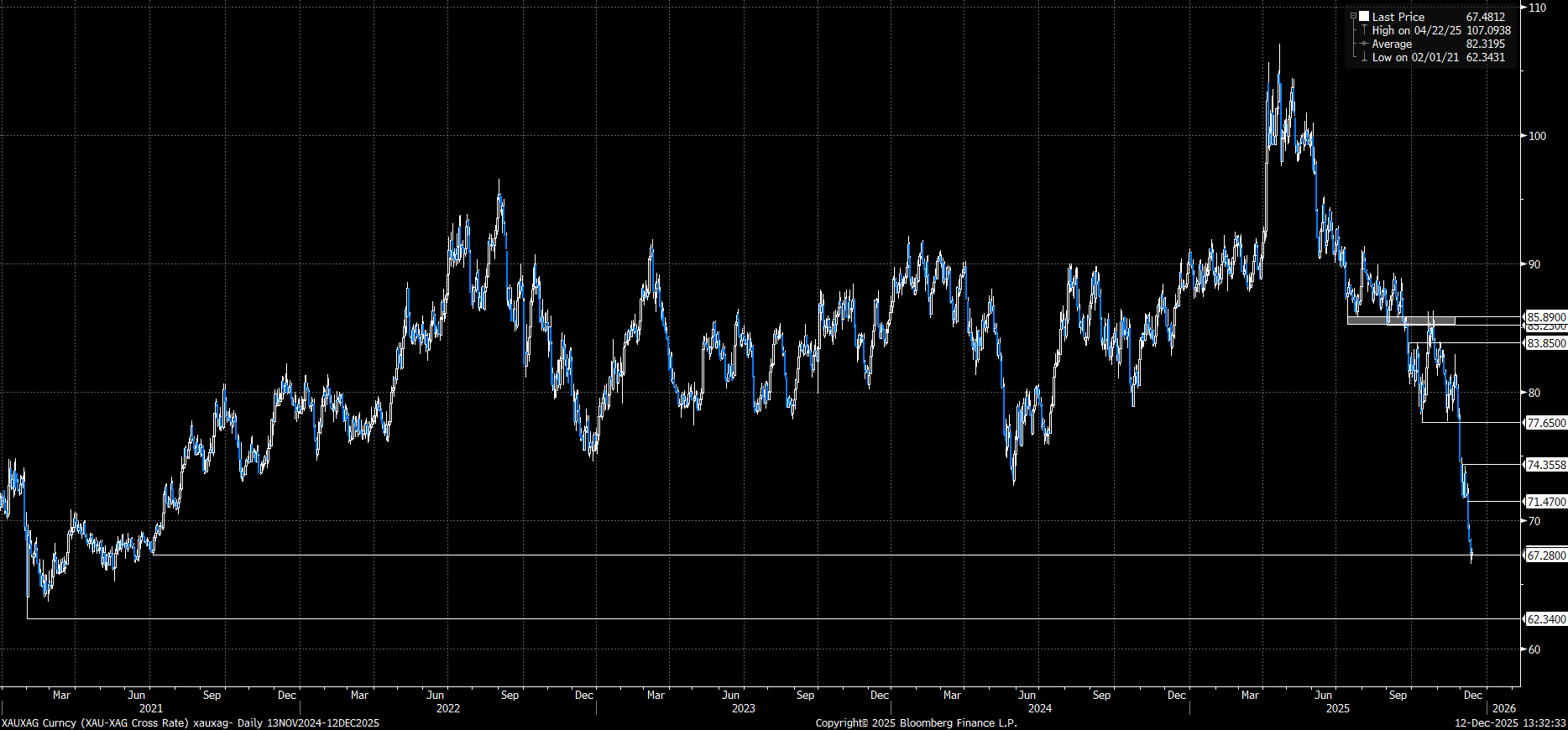 Gümüşün yeni rekor seviyelere yükselmesiyle birlikte rasyodaki sert düşüş eğilimi devam ediyor. 2021 yılı yaz aylarında görülen seviyelere kadar gerileyen rasyoda ilk aşamada 67,19 seviyesinin altında kalıcılık sağlanıp sağlanamayacağı, sonrasında ise 62,51 seviyelerini takip edeceğiz. 62,51 seviyesinin 2014’ten bu yana aşağı yönlü kırılamamış olması, bu bölgenin teknik açıdan önemini artırıyor. Olası toparlanma hareketlerinde ise rasyoda 71,83 seviyesi izleniyor olacak.