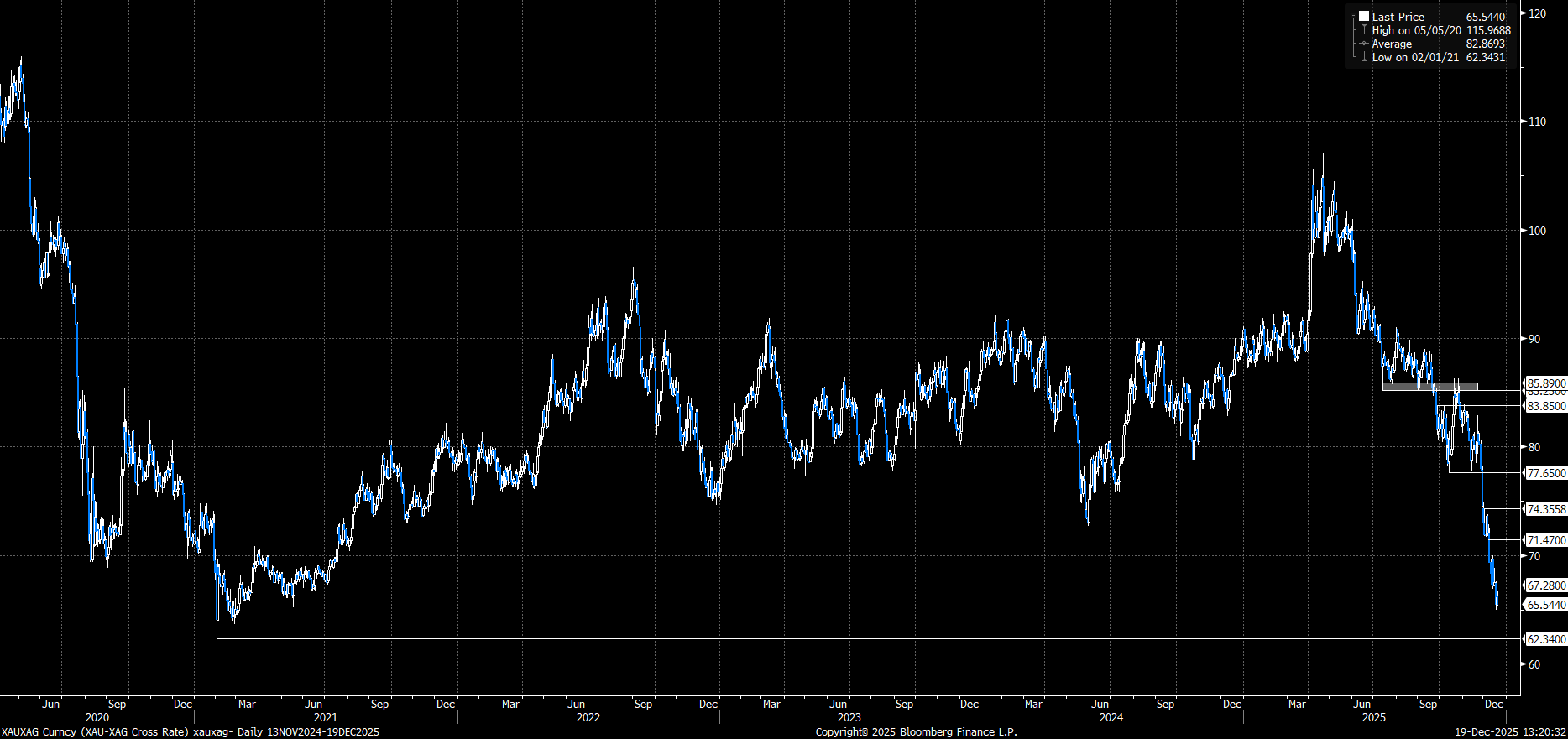Nisan ayından bu yana altına kıyasla daha yüksek getiri sunan gümüşün etkisiyle rasyoda düşüş eğilimi sürüyor. 2021 ortalarındaki seviyelere kadar gerileyen rasyoda 67,19 seviyesi altında kalıcılık sağlandı. Aşağı yönlü hareketin devamında 62,34 seviyesi takip edilecek. 62,34 seviyesinin 2014’ten bu yana aşağı yönlü kırılamamış olması, bu bölgenin teknik açıdan önemini artırıyor. Olası toparlanma hareketlerinde ise rasyoda 67,19 seviyesi izlenecek.